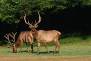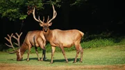 Wide shot of Elk (Cervus elaphus) stag in open grassland with dawn mist through treesBild: © Discovery Communications, Inc.