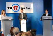 Der TV-Moderator (Axel Bulthaupt, Mitte) muss bei einer hitzigen Fernsehdebatte zwischen Nina (Ursula Karven) und ihrem Mann Robert (Hans-Werner Meyer, rechts) die Wogen glätten.