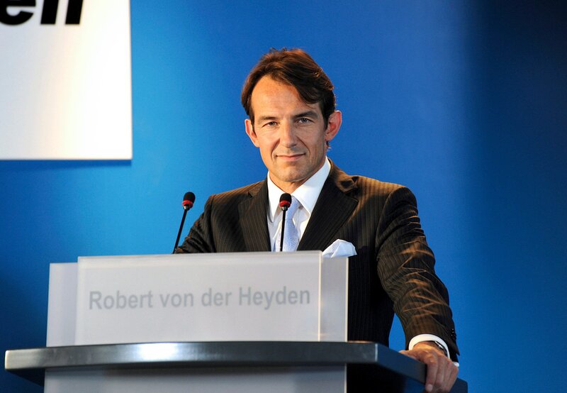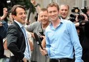 Der eloquente Bürgermeister Robert von der Heyden (Hans-Werner Meyer) spielt dem TV-Reporter (Max Engelke, rechts) routiniert die Bälle zu.