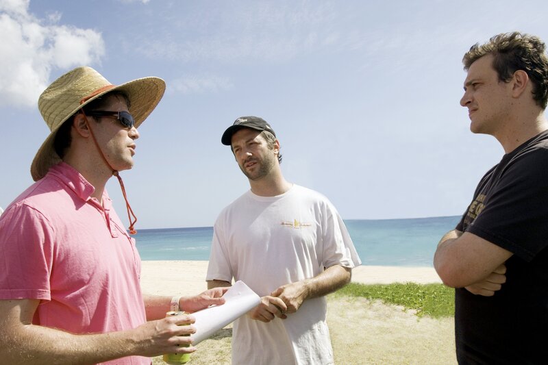 Peter (Jason Segel, l.) will nach der Trennung von seiner Freundin seine Wunden lecken und Abstand gewinnen. Deshalb bucht er einen Hawaii-Urlaub. Doch er rechnet nicht damit, dass seine Ex (Kristen Bell, r.) mit ihrem neuen Lover Aldous Snow (Russell Brand, M.) dieselbe Idee hat ...