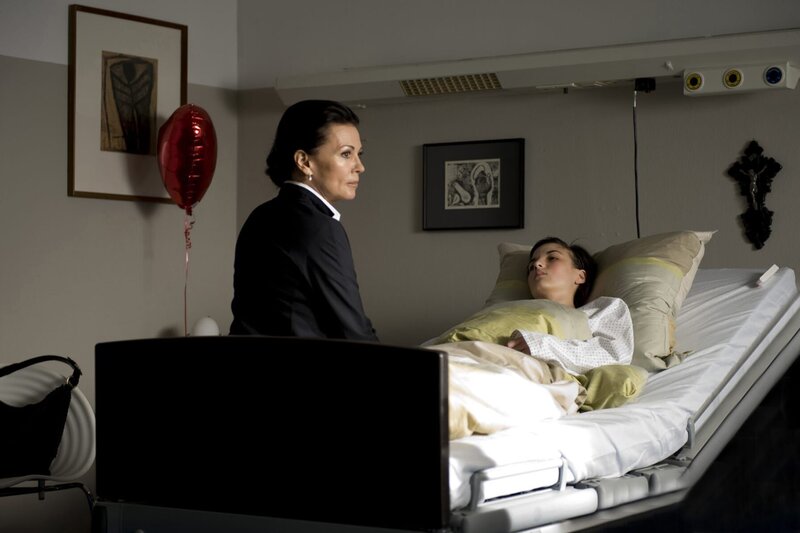 Nele (Paul Knüpling, r.) liegt im Krankenbett. Sie sieht krank und geschwächt aus. Sylivia (Iris Berben, l.) macht sich Sorgen.Bild: © ZDF und Stephanie Kulbach