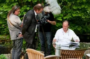 Kameraassistent Albrecht Klinger, Regisseur Günter Schilhan und Kameramann Erhard Seidl mit Nikolaus Harnoncourt bei Dreharbeiten .Bild: © ORF