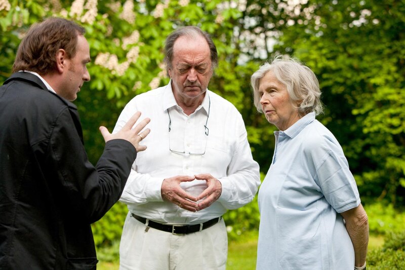 Regisseur Günter Schilhan und das Ehepaar Harnoncourt bei Dreharbeiten.Bild: © ORF / Werner Kmetitsch