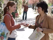 Andrea (Marie Zielcke, r.) lässt sich vom Verkäufer (Rainer Reiners, l.) eine äußere Brustprothese zeigen und entschließt sich, diese auch anzunehmen.