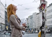 Das Stadtbild Berlins ist geprägt von Zetteln: Umzugshelfer, Wohnungsgesuche, Workshop-Angebote. Der Film spürt basierend auf dem gleichnamigen erfolgreichen Internet-Blog den Geschichten hinter den Zetteln nach. - An der geschäftigen Straßenkreuzung am Rosenthaler Platz erlebt eine trauernde Mutter (Andrea Sawatzki) einen kurzen Moment der Ruhe.Bild: © rbb/Darling Berlin/UCM.ONE