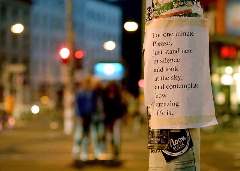 Das Stadtbild Berlins ist geprägt von Zetteln: Umzugshelfer, Wohnungsgesuche, Workshop-Angebote. Der Film spürt basierend auf dem gleichnamigen erfolgreichen Internet-Blog den Geschichten hinter den Zetteln nach. - Überall in der Stadt findet man diese Aushänge, welche die Passanten auffordern, in den Himmel zu schauen – eine Aktion des Künstlers Terry Savage, die leider fatale Folgen hat.Bild: © rbb/Darling Berlin/UCM.ONE