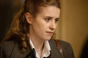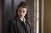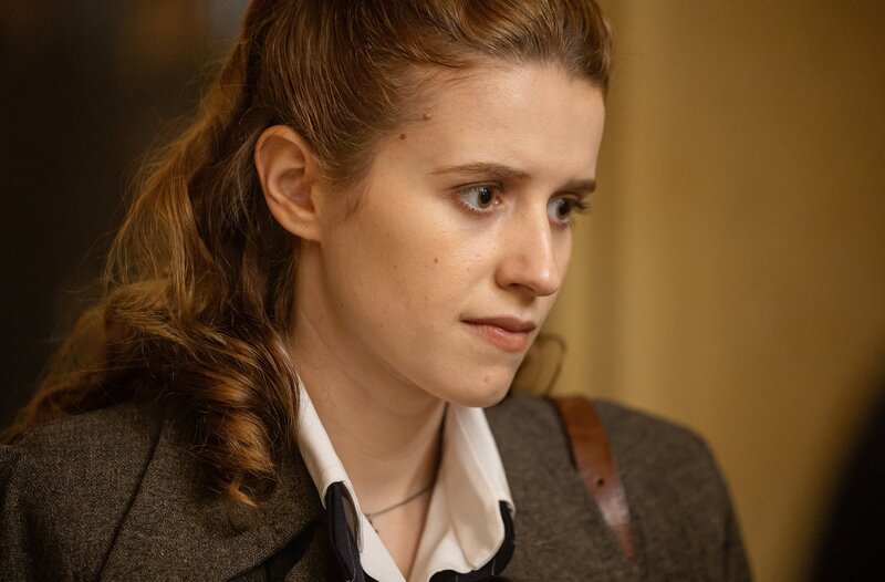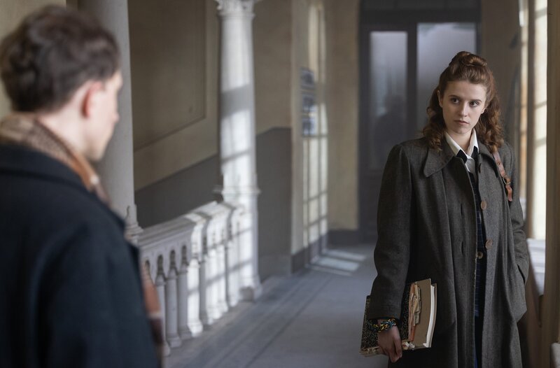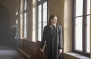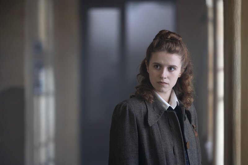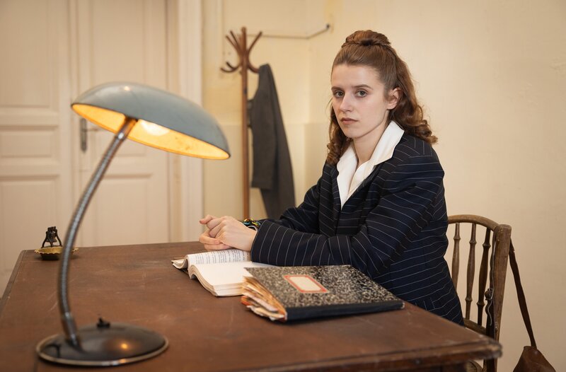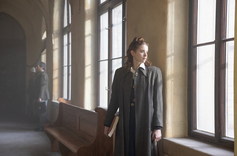Endloses Warten im Zeugenraum des Nürnberger Justizpalastes. Seweryna Szmaglewska (Katharina Stark) sorgt sich um ihren Verlobten Witold Wisniewski. Am Handgelenk der aus Drahtresten geflochtene Armreif, den ihr Witold im KZ Birkenau als Zeichen ihrer Verbundenheit geschenkt hat.Bild: © NDR/Márton Kállai