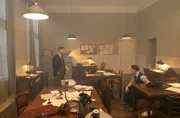 Sonderberichterstatter 104995? Wer soll das sein? Herman Göring (Francis Fulton- Smith) stößt in der Zeitung auf den Namen Ernst Michel.Bild: © NDR/Márton Kállai