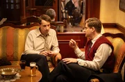 Otto Stahmer (Wotan Wilke Möhring, l.) macht Ernst Michel (Jonathan Berlin, r.) klar, dass keiner von diesem Treffen erfahren darf, er keine Zeile darüber schreiben wird.Bild: © NDR/Márton Kállai
