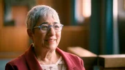 Ernst Michels Tochter Lauren Shachar am historischen Ort im Schwurgerichtssaal 600 des Nürnberger Justizpalastes. Eingeblendet: Originalaufnahmen des ersten der Nürnberger Prozesses.Bild: © NDR/Zeitsprung Pictures/Spiegel TV