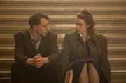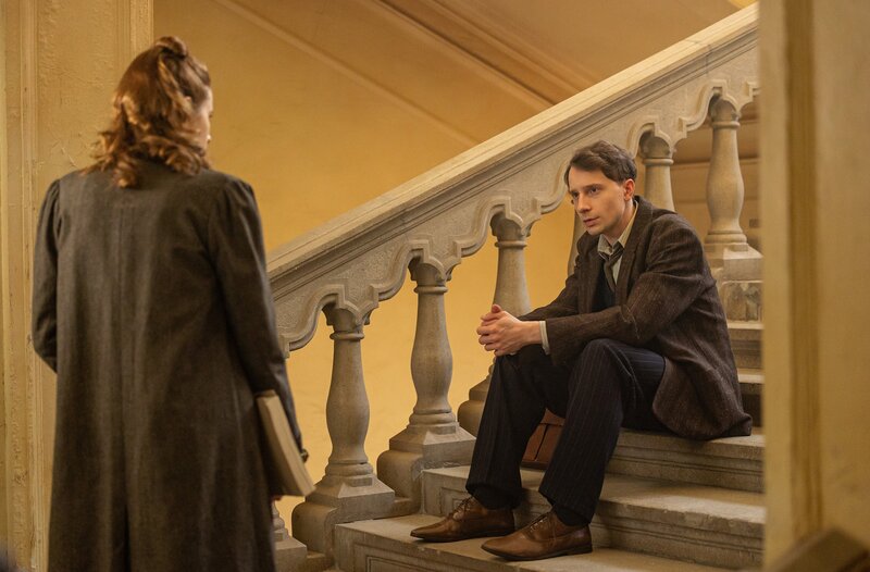 Was machen wir eigentlich hier? Seweryna Szmaglewska (Katharina Stark) und Ernst Michel (Jonathan Berlin) voller Zweifel auf den Treppen des Nürnberger Justizpalastes.Bild: © NDR/Márton Kállai