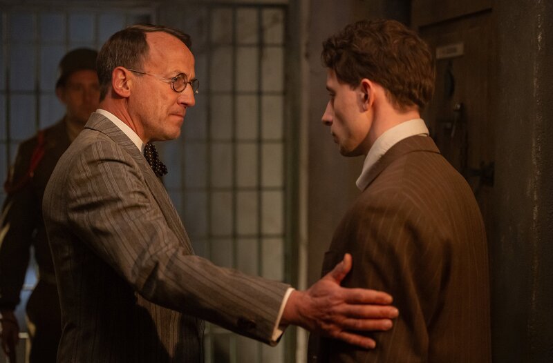 Die Zeit steht still. Hermann Göring (Francis Fulton-Smith) blickt Ernst Michel direkt in die Augen und reicht ihm selbstbewusst die Hand.Bild: © NDR/Márton Kállai