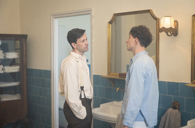 Der Auschwitz-Überlebende und der Dissident. Ernst Michel (Jonathan Berlin, r.) und Willy Brandt (Franz Dinda, l.) treffen im Waschraum des Faberschlosses aufeinander.Bild: © NDR/Márton Kállai
