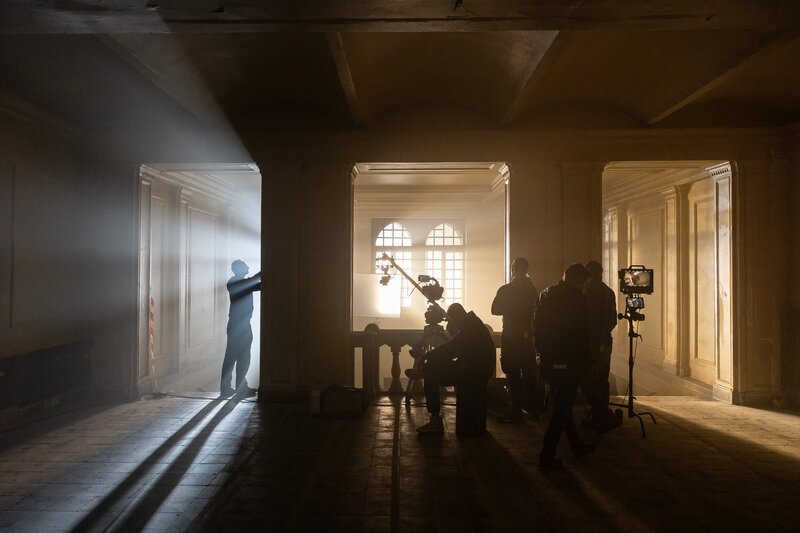 Bei den Dreharbeiten: Einleuchten des Motivs „Nürnberger Justizpalast“.Bild: © Zeitsprung Pictures GmbH/NDR/BR/Márton Kállai
