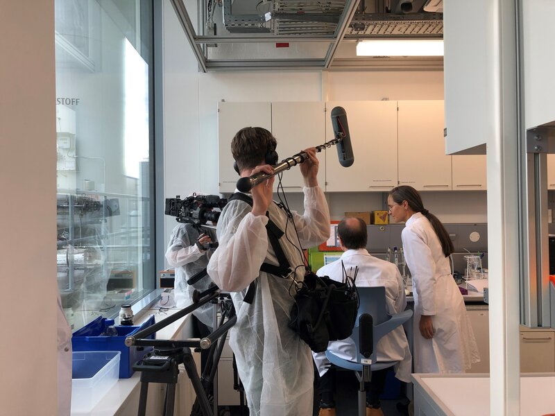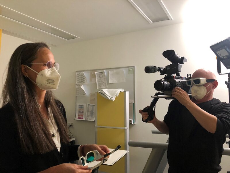 Ausgestattet mit Maske und Laser-Schutzbrille für Untersuchungen zum Fettgewebe im Muskel arbeitet Susanna Hofmann (Helmholtz Munich), mit Wissenschaftlern der TUM zusammen.