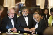 Reuben Tishkoff (Elliot Gould, M.), einer von Danny Oceans (George Clooney, l.) ursprünglichen Elf, wird von Kasinobesitzer Banks übel über den Tisch gezogen. Das nimmt den alten Haudegen so sehr mit, dass er sogar einen Herzinfarkt erleidet. Ocean schwört Rache ...
