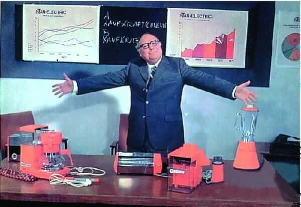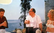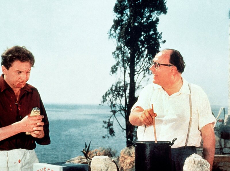 Konsul Otto Keyser (Heinz Erhardt, rechts) amüsiert sich über seinen eifersüchtigen Schwiegersohn in spe Thomas Steffen (Harald Juhnke), der im Urlaub nicht nur mit Ketchup seine Schwierigkeiten hat.