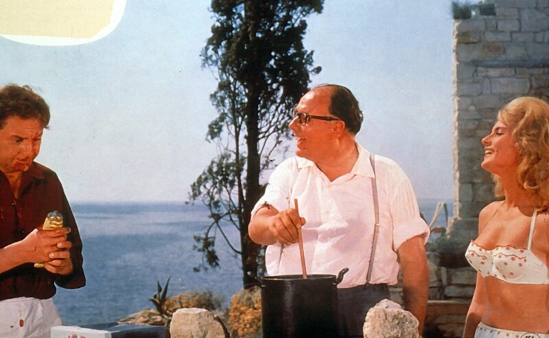 Konsul Kayser (Heinz Erhardt) und seine Tochter Marion (Ann Smyrner) amüsieren sich über den eifersüchtigen Thomas Steffen (Harald Juhnke, links), der im Urlaub nicht nur mit Ketchup seine Schwierigkeiten hat.