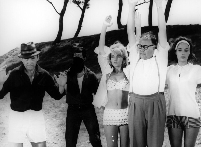 Der Urlaub fängt ja gut an! Konsul Kayser (Heinz Erhardt, 2. von rechts), seine Tochter Marion (Ann Smyrner, Mitte), Schwiegersohn in spe Thomas Steffen (Harald Juhnke, links) und Barbara Holstein (Karin Dor, rechts) sehen sich von maskierten Räubern auf einer kleinen Mittelmeerinsel überfallen.