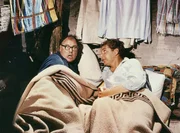 Otto Keyser (Heinz Erhardt, li.) hat sich seine erste Urlaubsnacht anders vorgestellt. Thomas Steffen (Harald Juhnke) muss zusehen, wie er seinen Schwiegerpapa in spe beruhigt.