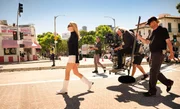 Filmproduzent Marvin Schwarz (Al Pacino, r.) bietet Rick Dalton (Leonardo DiCaprio, M.) ein Engagement für Italo-Western an. Cliff Booth (Brad Pitt, l.) ist mit von der Partie.
