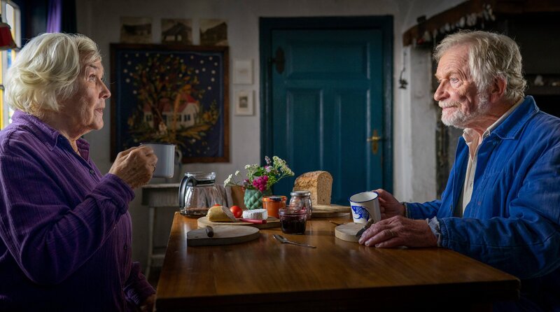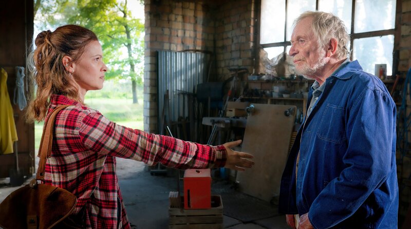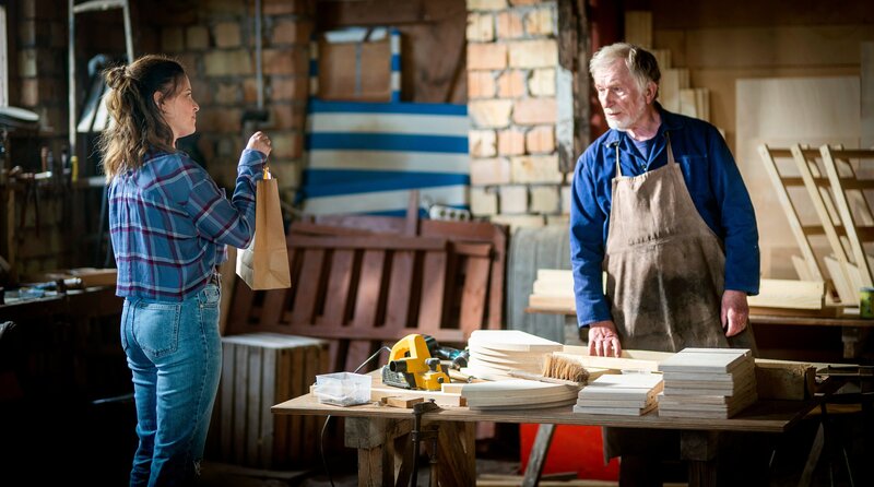 Tischlerin Eva Jensen (Jennifer Ulrich, li.) versucht Hinrichs (Hermann Beyer, re.) Sympathien zu gewinnen und bringt ihm seine Lieblingsfischbrötchen mit.