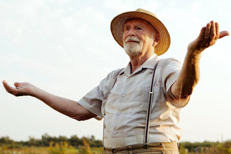 Wenn er mit Vogelfutter in den Händen in der Wiese steht, hofft Karl (Klaus A. Müller-Oi), dass die Vögel zu ihm zurückkehren.Bild: © MDR/SWR/Bavaria Fernsehproduktion/Daniela Incoronato