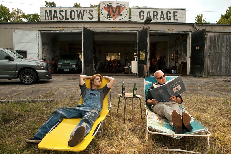 Es ist nicht wirklich viel los in Endlingen, auch nicht in Maslows Garage. Maslow (Joachim Król) selbst und Ben (Sven Gielnik) haben viel Zeit, zu träumen. Wobei Ben eher von den Weiten Afrikas träumt und Maslow Pläne spinnt, Endlingen endlich wieder zu Aufschwung zu verhelfen.Bild: © rbb/SWR/Bavaria Fernsehproduktion/Daniela Incoronato