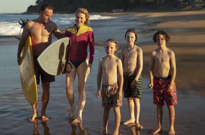 Sam (Naomi Watts, 2. v. li.) und Cameron (Andrew Lincoln, li.) mit ihren Söhnen Noah (Griffin Murray-Johnston, 2. v. re.), Oli (Abe Clifford-Barr, Mitte) und Rueben (Felix Cameron, re.).Bild: © ARD Degeto/Leonine Studios