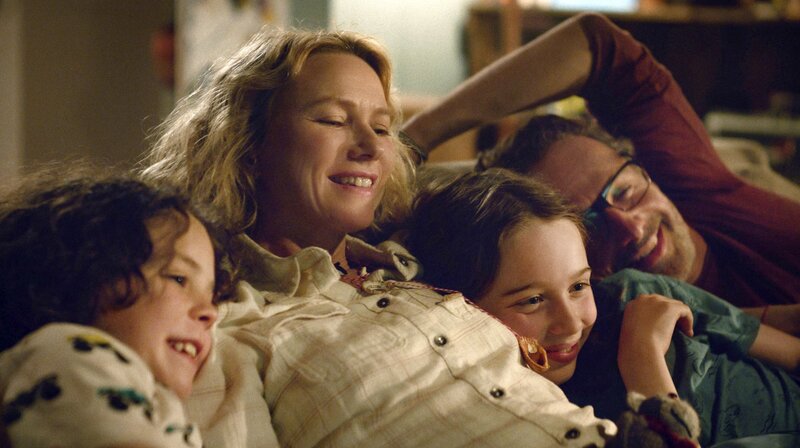 Sam (Naomi Watts, 2. v. li.) und Cameron (Andrew Lincoln, re.) kuscheln mit ihren Kindern Noah (Griffin Murray-Johnston, 2. v. re.) und Rueben (Felix Cameron, li.).Bild: © ARD Degeto/Leonine Studios