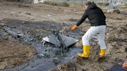 Der Künstler (Michael Hirschbichler) mit gelben Gummistiefeln in einer Ölpfütze schaufelt öliges Wasser auf eine Leinwand.Bild: © ORF/NAVIGATOR FILM & Vive LaDok