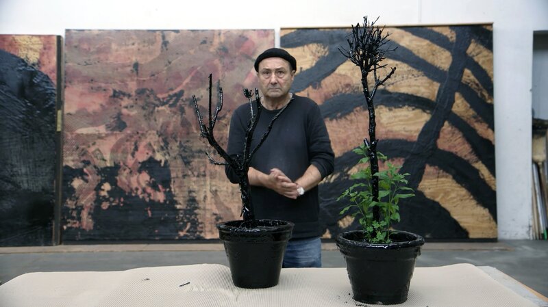 Der Künstler Albert Schöpflin präsentiert zwei Blumentöpfe, in denen sich mit Teer übergossene Pflanzen befinden; in einem Topf sprießen frische grüne Zweige.Bild: © ORF/NAVIGATOR FILM & Vive LaDok