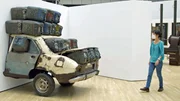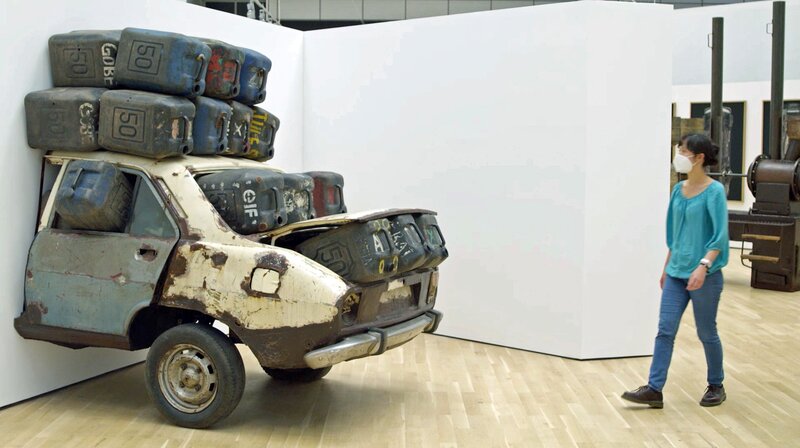 Eine Ausstellungsbesucherin vor dem Kunstwerk Elf rien à foutre (Künstler: Romuald Hazoumè): ein halbes verrostetes Auto vollgefüllt mit Benzinkanistern, die auch auf dem Dach befestigt sind; das Auto verschwindet zur Hälfte in der Wand.Bild: © ORF/NAVIGATOR FILM & Vive LaDok