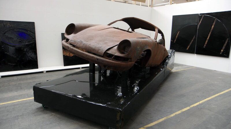 Ein ausgebrannter und verrosteter Porsche auf einem Teer-Sockel (Künstler: Albert Schöpflin).Bild: © ORF/NAVIGATOR FILM & Vive LaDok