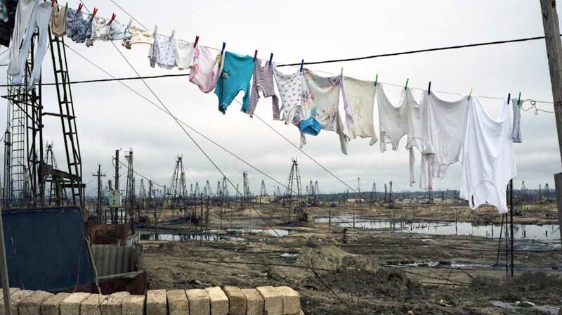 Eine Wäscheleine voller Kinderkleidung, im Hintergrund Ölförderstellen und verwüstete Landschaft in Baku/Aserbeidschan (Liquid Land, 2008; Künstlerin: Rena Effendi).Bild: © ORF/NAVIGATOR FILM & Vive LaDok