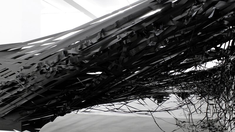 Schwarzes Klebeband ist dicht durch einen weißen Raum gespannt (Künstlerin Monika Grzymala).Bild: © ORF / NAVIGATOR FILM & Vive LaDok