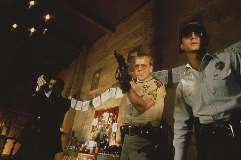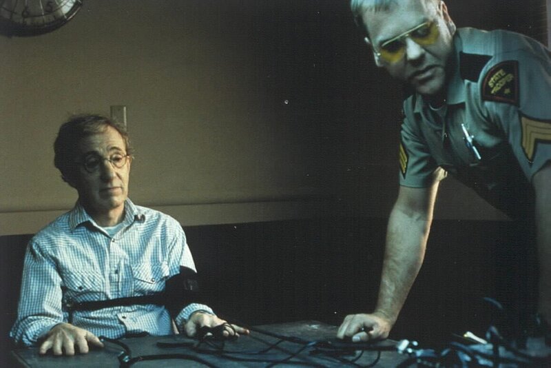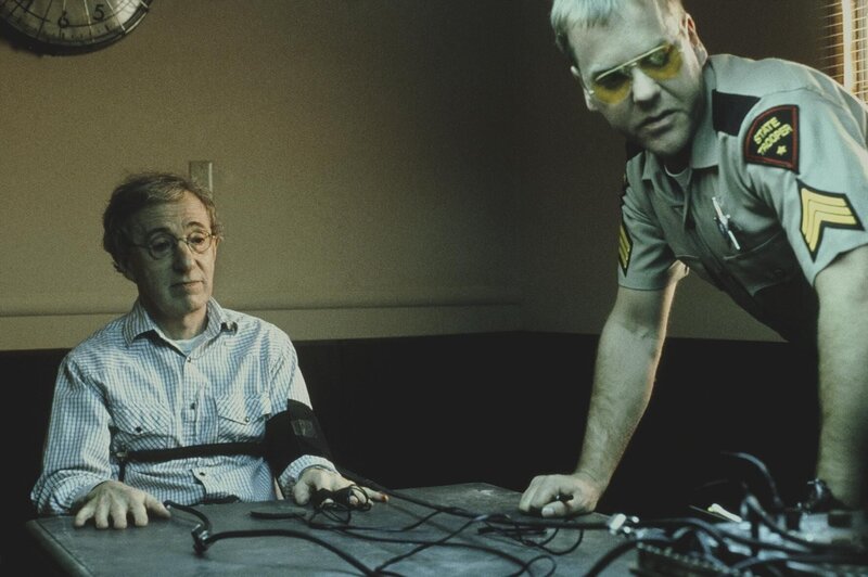 Als Tex (Woody Allen, l.) die Hand seiner Frau auf einem Zeitungsfoto entdeckt und sofort nach New Mexiko aufbricht - dicht gefolgt von dem nach Rache sinnenden Sheriff (Kiefer Sutherland, r.) - nimmt das Chaos seinen Lauf ...Bild: © MIRACULOUS HANDS PROD.