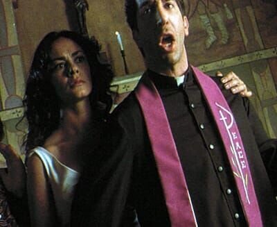 Nach all den Wundern, die geschehen sind, will Desi (Maria Grazia Cucinotta, l.), die meistfrequentierte Hure der Stadt, ihren Job aufgeben, was natürlich ihrem stürmischen Liebhaber, dem Priester des Ortes (David Schwimmer, r.), nicht gefällt ...Bild: © MIRACULOUS HANDS PROD.