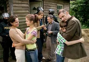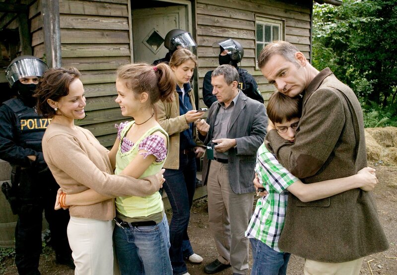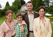 Nach dem glimpflichen Ausgang der vorgetäuschten Entführung ist Herrmann Königstein (Heinrich Schafmeister, rechts) froh, seinen Sohn Amadeus (Robin Becker, 2. von rechts) wohlbehalten in die Arme schließen zu können. Und Ida Königstein (Sonja Kirchberger, links) bedankt sich bei der aufgeweckten Pik (Sidonie von Krosigk, 3. von links). Kommissar Hetzel (Rudolf Kowalski, 3. von rechts) und seine Kollegin Becker (Sabine Flack, Mitte) fällt ebenfalls ein Stein vom Herzen.