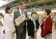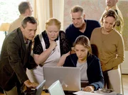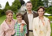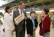 Nach dem glimpflichen Ausgang der vorgetäuschten Entführung ist Herrmann Königstein (Heinrich Schafmeister, re.) froh, seinen Sohn Amadeus (Robin Becker, 2.v.re.) wohlbehalten in die Arme schließen zu können. Und Ida Königstein (Sonja Kirchberger, li.) bedankt sich bei der aufgeweckten Pik (Sidonie von Krosigk, 3.v.li.). Kommissar Hetzel (Rudolf Kowalski, 3.v.re.) und seine Kollegin Becker (Sabine Flack, Mitte) fällt ebenfalls ein Stein vom Herzen.