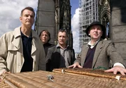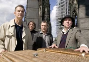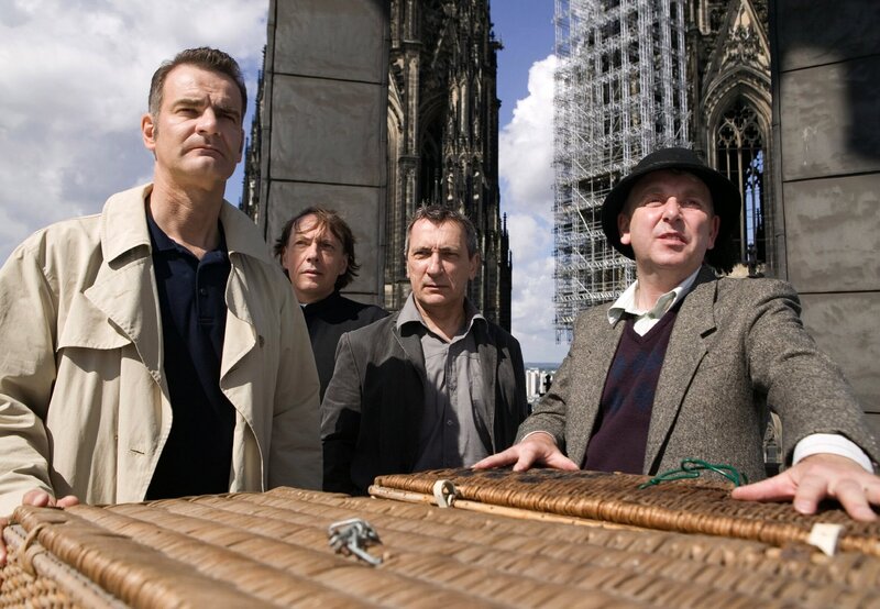 Herrmann Königstein (Heinrich Schafmeister, li.) und der Küster (Jürgen Trott, 2.v.li.) beobachten auf dem Kölner Dom, wie Kommissar Hetzel (Rudolf Kowalski, 2.v.re.) zusammen mit einem Taubenexperten (Erwin Grosche, re.) Brieftauben abfliegen lässt.