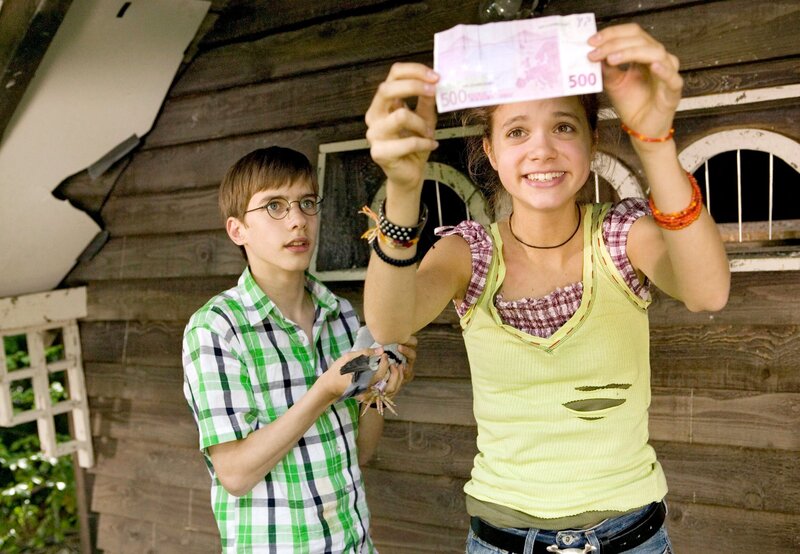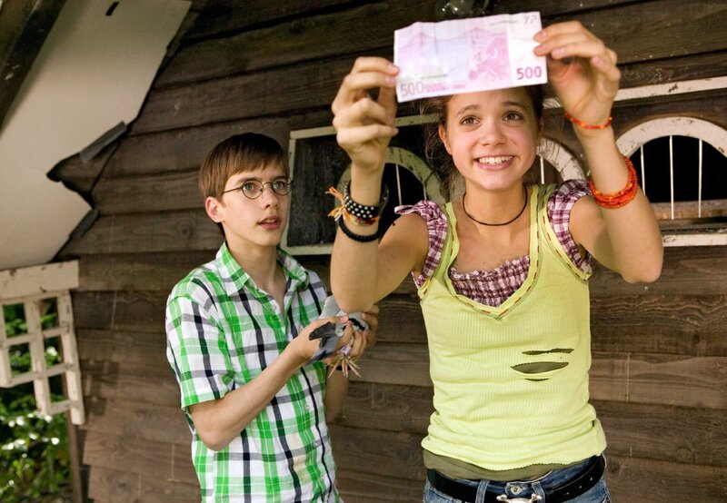 Pik (Sidonie von Krosigk) und ihr Freund Amadeus (Robin Becker) haben den ersten Geldschein von dem Fuß einer Taube abgewickelt.