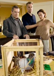 Die Operndiva Ida Königstein (Sonja Kirchberger, re.), ihr Gatte Herrmann (Heinrich Schafmeister, Mitte) sind skeptisch, ob der Plan von Kommissar Hetzel (Rudolf Kowalski) funktioniert, der den Entführern mittels präparierter Brieftauben auf die Spur kommen will, die mit einem Sender ausgestattet sind.