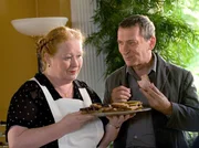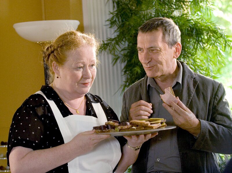 Kommissar Hetzel (Rudolf Kowalski) hat eine Schwäche für die leckeren Schnittchen der Haushälterin Hanni (Ulrike Bliefert).