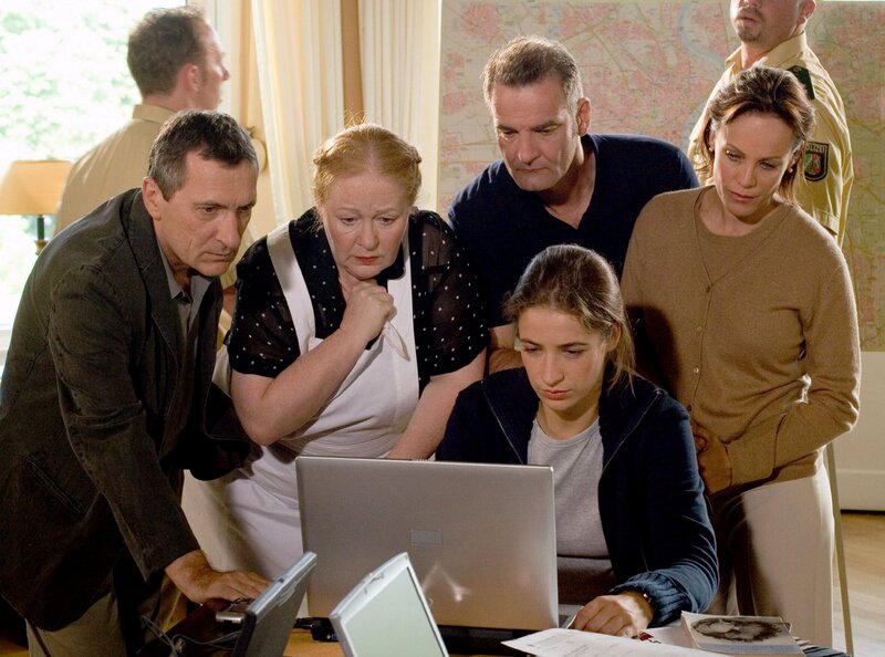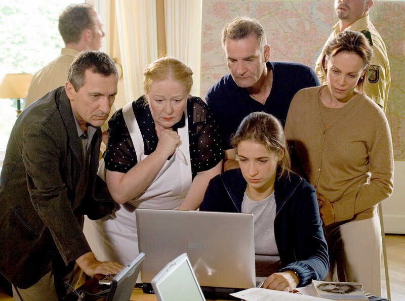 Die Operndiva Ida Königstein (Sonja Kirchberger, re.), ihr Gatte Herrmann (Heinrich Schafmeister, 2.v.re.) und die nette Haushälterin Hanni (Ulrike Bliefert, 2.v.li.) sind in heller Aufregung, weil der Sohn der Königsteins entführt wurde. Kommissar Hetzel (Rudolf Kowalski, li.) und seine Kollegin Becker (Sabine Flack, Mitte) versuchen Kontakt mit den Entführern aufzunehmen.