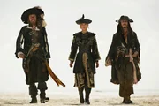 Wollen die neun Piratenlords zusammentrommeln, um mit vereinten Kräften die übermächtige Flotte des Feindes schlagen zu können: Turner (Orlando Bloom, 3.v.l.), Sparrow (Johnny Depp, r.) und Barbossa (Geoffrey Rush, 2.v.l.) ...