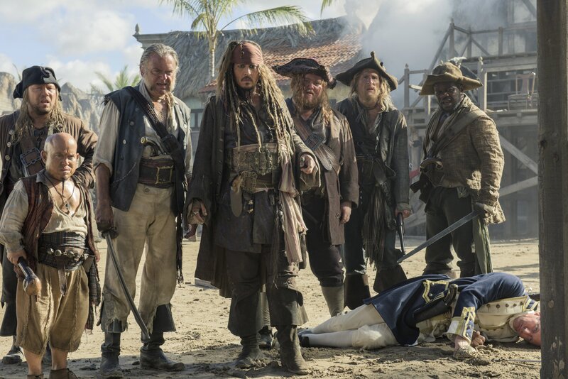 (v.l.n.r.): Scrum (Stephen Graham); Marty (Martin Klebba); Joshamee Gibbs (Kevin R. McNally); Captain Jack Sparrow (Johnny Depp); Bollard (Danny Kirrane); Cremble (Adam Brown); Pike (Delroy Atkinson)Bild: © Disney Enterprises, Inc. All Rights Reserved. / Peter Mountain Lizenzbild frei