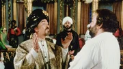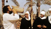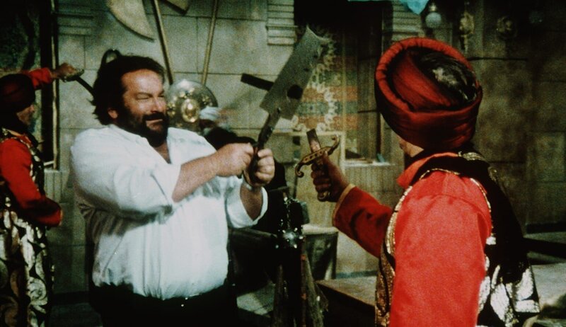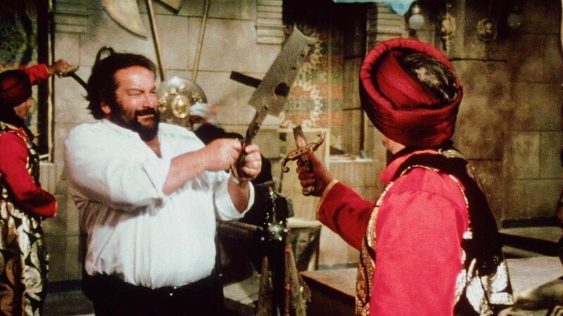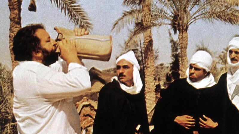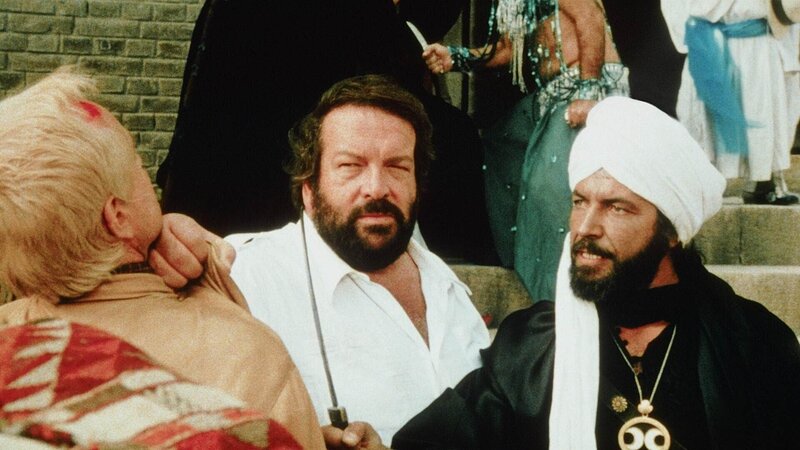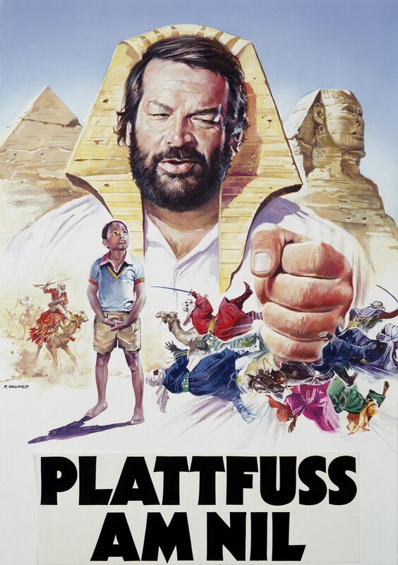 Kein Wunder, dass sich für den skurrilen Professor auch andere interessieren, so eine internationale Bande, die vom «Schweden» befehligt wird. Selbst Plattfuss, der ja aus seiner Heimatstadt Neapel allerhand Unbill gewohnt ist, hat Mühe, mit den Geheimnissen des Orients klarzukommen. Seine beiden Begleiter machen ihm die Arbeit keineswegs leichter. Sehr bald lässt der «Schwede» nichts unversucht, den unerschrockenen Kommissar aus dem Weg zu räumen. So lernt Plattfuss die Altstadt von Kairo kennen, die Basare und Opiumhöhlen. Er balgt sich mit wirbligen Finsterlingen, und nach einer wortwörtlich wüsten Verfolgungsjagd, die sogar ein Wettschwimmen mit Krokodilen mit einschliesst, landet der Kommissar schliesslich im Zentrum der geheimnisvollen Organisation, einer scheinbar friedlichen Oase. Worauf dem grossen Fäustefliegen nach wie vor Bud Spencers unerreichtem Markenzeichen nichts mehr im Wege steht.