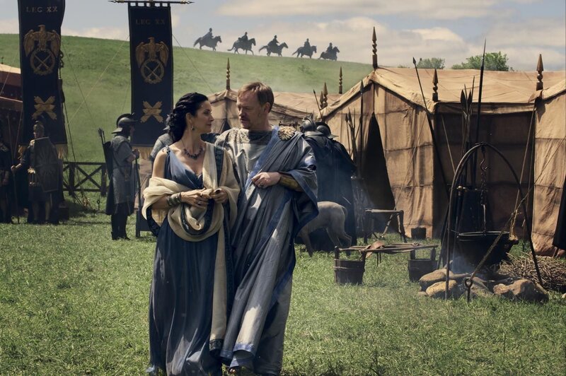 Noch hoffen Severus (Jared Harris, r.), Stadtoberhaupt von Pompeii, und seine Frau Aurelia (Carrie-Anne Moss, l.), dass sie Senator Corvus überreden können, in Pompeii zu investieren. Eine völlige Fehleinschätzung, denn der skrupellose Römer verfolgt ganz andere Interessen ...Bild: © Constantin Film Verleih GmbH / Caitlin Cronenberg