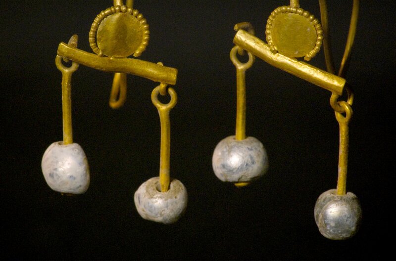 Ein Paar Goldohrringe aus dem Schatz, der neben der Leiche einer Frau (möglicherweise der Ehefrau von Aulus Rustius Verus) in einem Raum der Villa gefunden wurde